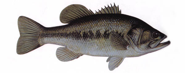 The upper jaw of the largemouth bass extends beyond its eye, making it easily distinguishable from its relatives. There is an obvious, deep notch that almost separates the first and second dorsal fins. There are no scales on the second, soft-rayed dorsal fin (12-13 rays). Its back is usually a dark green color, while lighter green on the sides and silvery on the belly. A dark horizontal band lines the entire length of the body, although this band maybe become difficult to distinguish on older fish. |