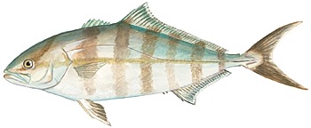 The Banded rudderfish feeds on other smaller fish and shrimp. |