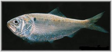 The Gulf Menhaden is typically around 50 inches long and is found in the Gulf of Mexico. It has a fairly deep and compressed body, with a black spot behind the gill opening, followed by a series of spots. |
