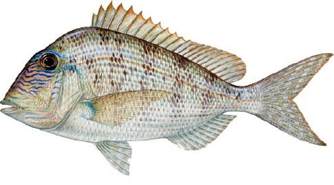 Littlehead porgy have a compressed, deep body that is somewhat circular in shape. They have a distinct hump on the back just before the dorsal fin. Coloration is mainly silvery highlighted with copper or brass around the edges and throughout the body, especially on the fins. There also are unconnected vertical copper bars on the side. The snout and cheek are bluish-gray and some blue coloring may be present throughout the body. The tail fin is deeply forked, and the head, as their name suggests, is small and ends in a short snout. They have a small mouth, a fairly long pectoral fin and two, connected dorsal fins, the first with spines and the second with soft rays. |