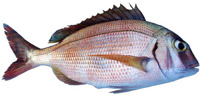 The Red Porgy is light in color with reddish silver overall and a pinkish tail. |