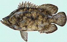 Tripletail get their name from the combination of their dorsal and anal fins, which extend far back to the tail, giving the appearance of three tails. They have a deep, rounded shape similar to grouper or freshwater bream. The eyes are located close to the snout and mouth, which has a protruding lower jaw. The color of the tripletail ranges from yellowish to brown with spots and mottles on the sides. |