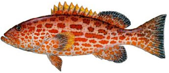The Yellowfin Grouper’s head and body have red spots and irregular longitudinal rows of rounded dark blotches. The Yellowfin is named for its pectoral fin, which has a yellow margin. The Yellowfin Grouper has 11 dorsal spines, usually 16 dorsal rays, usually 11 anal rays, and usually 17 pectoral rays. Its posterior nostril is larger than the interior and the posterior margin of the caudal fin is concave. |