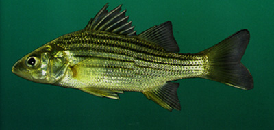 Although yellow bass are sometimes confused with white bass, there are several distinguishing characteristics. First, the belly may take on a yellow color, from which the species derives its common name. Second, unlike other temperate bass, the two lowermost stripes are distinctively broken just posterior to the middle. Also, the second and third anal spines are approximately equal in length. The yellow bass have no teeth on the tongue. |