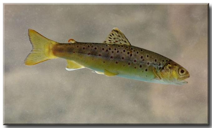 Brown trout are brown to gold on their back with a cream to slate-colored belly. Most fish have black, gray, yellow and occasionally red spots all surrounded by a white halo. This species has a very noticeable spotted adipose fin between the dorsal and caudal fin. There are no spots on the squarish tail or wormy marks on the back. These features help to distinguish it from other trout. |