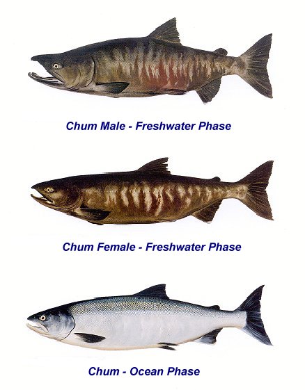 The chum salmon live in the Pacific and Arctic Oceans. During the spawning season the chum are known to ascend rivers for a considerable distance, some as far as 1200 miles. |