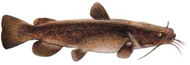 Flathead catfish are typically pale yellow to light brown on the back and sides, and highly mottled with black and brown. The belly is usually pale yellow or cream colored. The head is broadly flattened, with a projecting lower jaw. The tail fin is only slightly notched, not deeply forked, as is the case with blue and channel catfish. Young fish may be very dark, almost black in appearance. They have a large adipose fin and short anal fin with 12-18 rays.  |