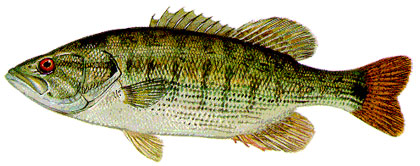 Redeye bass generally have a greenish to brownish color with faint side markings and no dark lateral stripe. Adults have red eyes and red fins. There is a dark spot on the gill cover and an oval to rectangular patch of teeth on its tounge. They hold many similar characteristics to a smallmouth bass, with clearly connected dorsal fins and a mouth that extends no further than the middle of the eye.  |