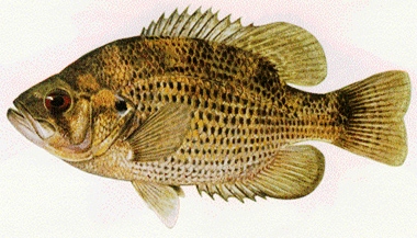 Rock bass are thick, heavy bodied fish with a dark slate or olive-green color and also a bronze and coppery colored tone. The mouth is large and extends beyond the front edge of their red eyes. The rock bass have six anal fin spines which help distinguishes them from the warmouth, which has three. They also have rows of spots that form lateral lines on the sides.  |