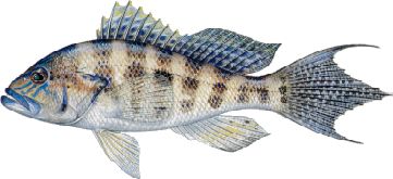 This Sea Bass is pale olive or brassy brown in color with indistinct black blotches that form vertical barrings. The blotch above the pectoral fin is darker than the other blotches. There are wavy blue lines on head; lips are purplish-blue; caudal fin tri-lobed on adults; and the edge of the nape is unscaled. |