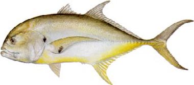 This jack has a bluish-green to greenish-gold colored back and silvery or yellowish belly. It has soft dorsal and anal fins almost identical in size; prominent black spot on the gill cover; black spot at the base of each pectoral fin and no scales on the throat. |