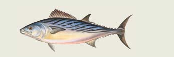 The body of the Pacific bonito is cigar-shaped and somewhat compressed. The head is pointed and conical, and the mouth is large. The color is dark blue above, dusky on the sides becoming silvery below. There is a number of slanted darkish stripes along the back. Pacific bonito are the only tuna-like fishes on the California coast that have the slanted dark stripes on their backs. |
