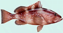 The Red Grouper is overall light or rusty red with whitish spots and large blotches on their sides in an unorganized pattern. The Red Grouper can be easily confused with the Nassau Grouper. The most distinguishable trait is the dorsal fin. The top of a Nassau Grouper's fin is notched, but the Red's is smooth. Also the tips of the Nassau Grouper's fins can be yellow whereas a Red's are black. |