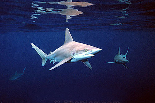 The Sandbar Shark ranges in color from gray to brown above and whitish below. It has a broadly rounded and short snout and the upper and lower teeth are finely serrated. Distinctive features are the wide, triangular dorsal and pectoral fins - with the dorsal situated almost directly above the pectoral. |