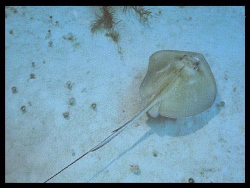 The stingray feeds on crabs, fish, worms, and shrimp. |