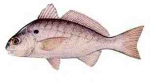 The Spot is grayish-silver overall, with golden reflections along the upper sides, and 12 to 15 oblique, dark lines extending from the dorsal fins to below the lateral line. A characteristic, prominent, black spot, about the same size as the eye, is located behind the gill cover. The dorsal and caudal fins are dusky, whereas the other fins are generally pale yellow. |