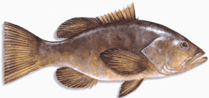 Warsaw Groupers are mottled dark brown, shading to slightly lighter brown on lower portions. Their tail is square and yellowish in color and their second dorsal spine is elongated and crest-like. |
