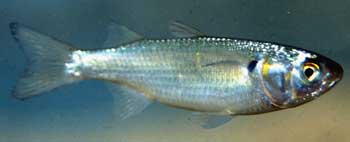 The long and slender White Mullet is bluish-gray on its upper body, which fades to silver on the sides and white underneath. They lack stripes, which helps to distinguish them from the striped or black mullet. The white mullet has a small triangular mouth with small teeth. There is a dark splotch at the base of the pectoral fin, and the moderately forked tail fin is edged in black. The dorsal fins of the White Mullet are widely separated, with the second beginning just past the start of the anal fin. |