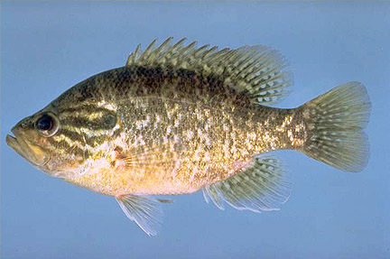 The mouth is large on the warmouth, with the upper jaw extending to or beyond the middle of the eye. The coloration is dark olive-brown and irregular bars appear on the sides of the fish. Warmouth have only three anal fin spines, which distinguish it from the rock bass that have six.  |