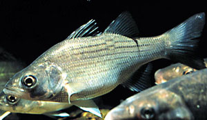 As with other true basses, the dorsal fin is clearly double, separated into spiny and soft-rayed portions. White bass are silvery shading from dark-gray or black on the back to white on the belly. Several incomplete lines or stripes run horizontally on each side of the body. Adults resemble young striped bass, and the two are often confused. However, striped bass have two distinct tooth patches on the back of the tongue, and white bass have one tooth patch.  |