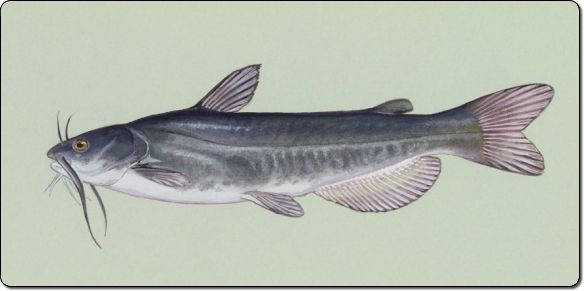The sides on the white cat are blue-gray to blue-black and may be mottled. The tail is moderately forked, and the anal fin is shorter and rounder than that of Channel or Blue catfish. White Catfish have only 20 to 24 anal fin rays. The chin barbels are white or yellow. They have a blunt, more-rounded head, and they lack black spots on their body.  |